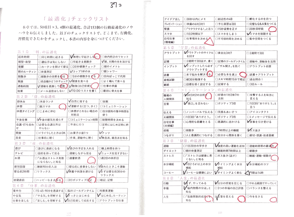 巻末のチェックリストでは153個中37個がすでに実践できていました。 さらに、『行動最適化大全』を読んで改善した習慣や新しく始めたものを加えると、 50個が毎日の生活に組み込まれています。